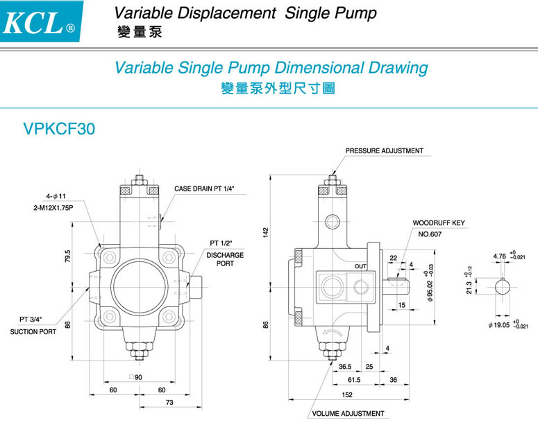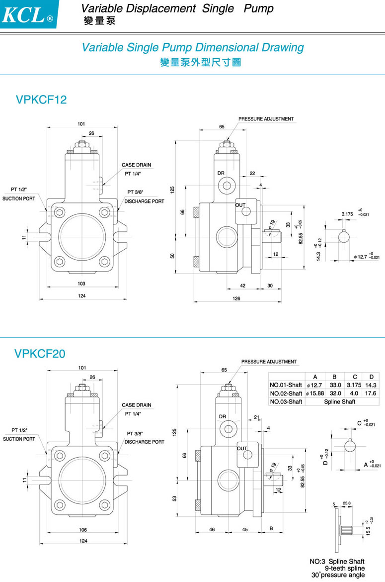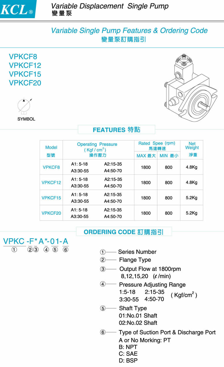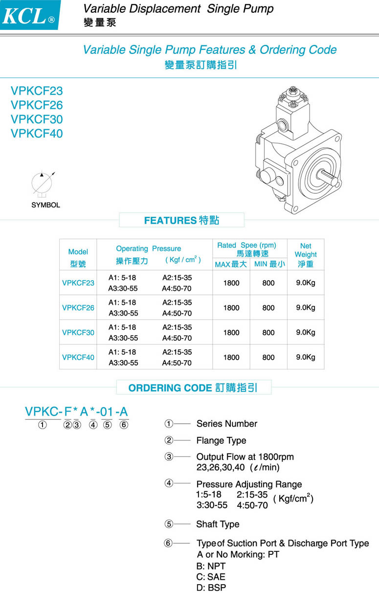 Taiwan Kaijia KCL variable pump: VPKCF8, VPKCF12, VPKCF15, VPKCF20, VPKCF23, VPKCF26, VPKCF30, VPKCF40.